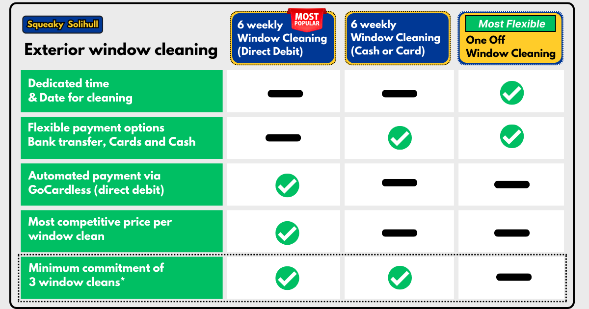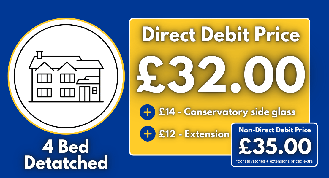 For regular window cleaning we complete the cleaning on a 6 weekly schedule offered at a discounted rate when added to a round with the best price when payments are made on direct debit, the most automated hands off way to pay for ongoing window cleaning